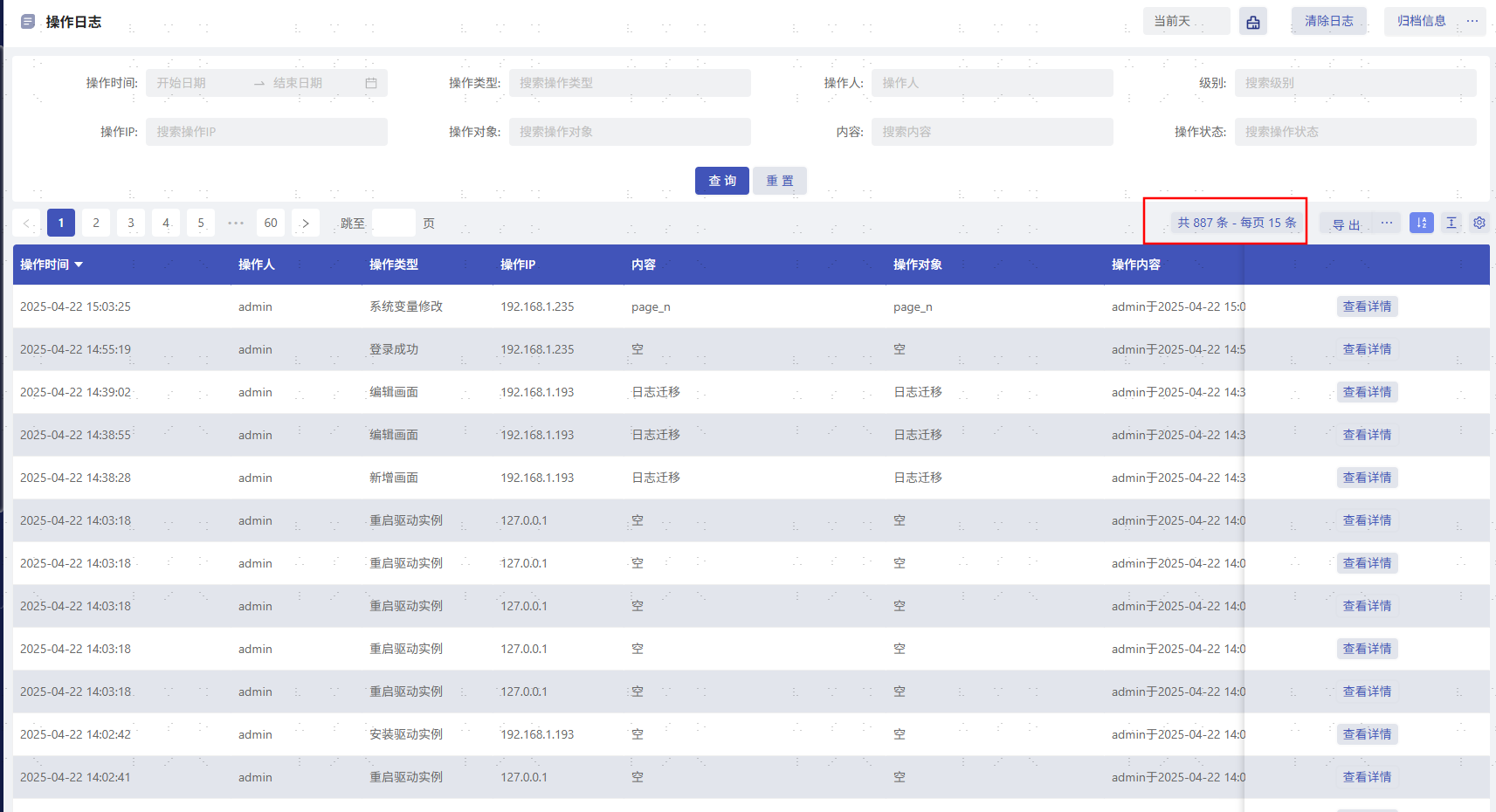 你的操作日志大概有多少条,建议你可以归档一部分,再在画面查看,或者在前台你可以引用内置的操作日志页面